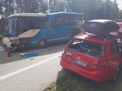 HASIČI BENEŠOV a Votice: Dopravní nehoda dvou osobních automobilů a autobusu ve Voticích. Komunikace I/3 je uzavřena.