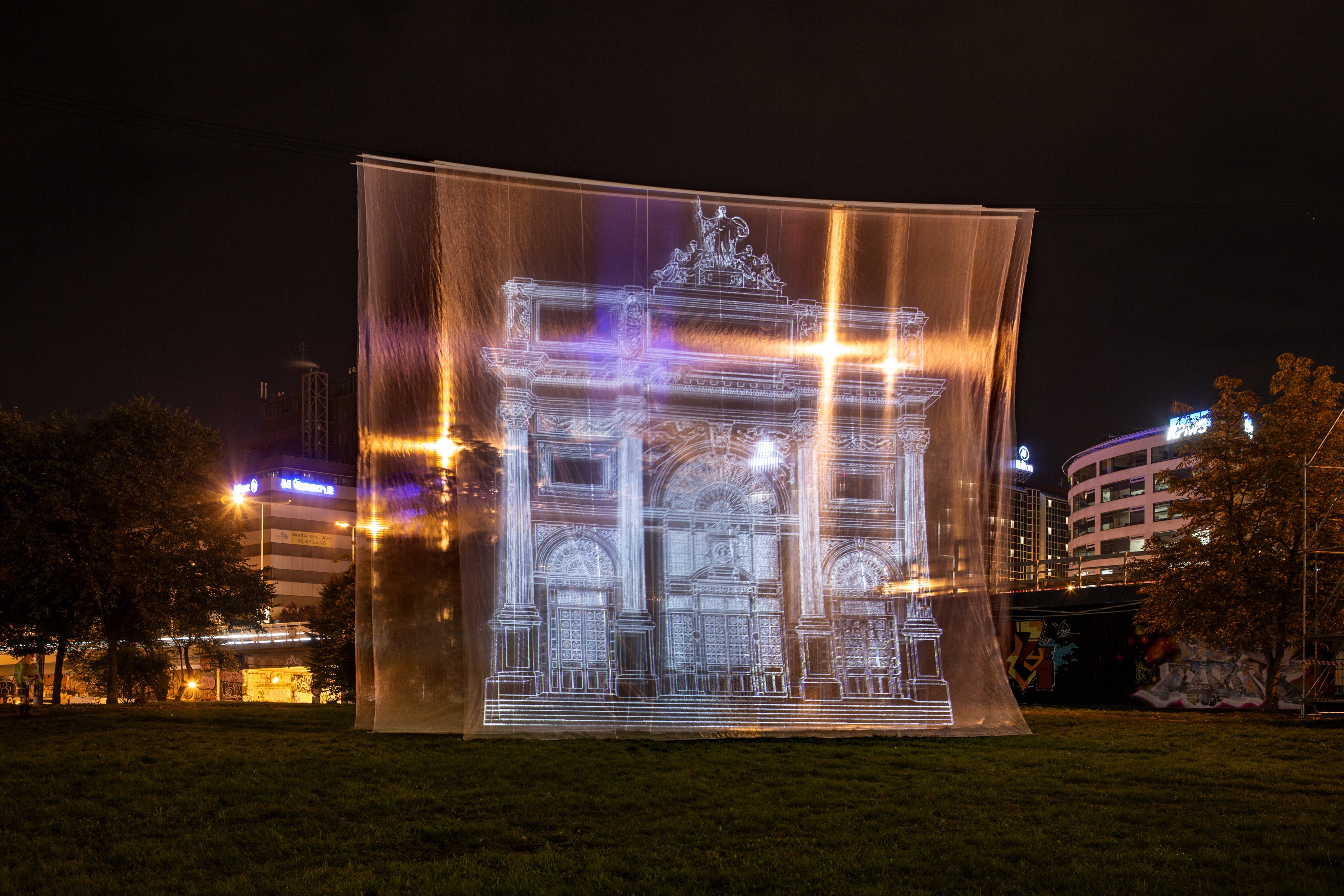 Digitálně upravené technické výkresy promítané na průsvitné látky se budou v pohybu větru proměňovat stejně jako paměť města. Spolu s dobovými exponáty tak až do neděle oživí park železniční historií.