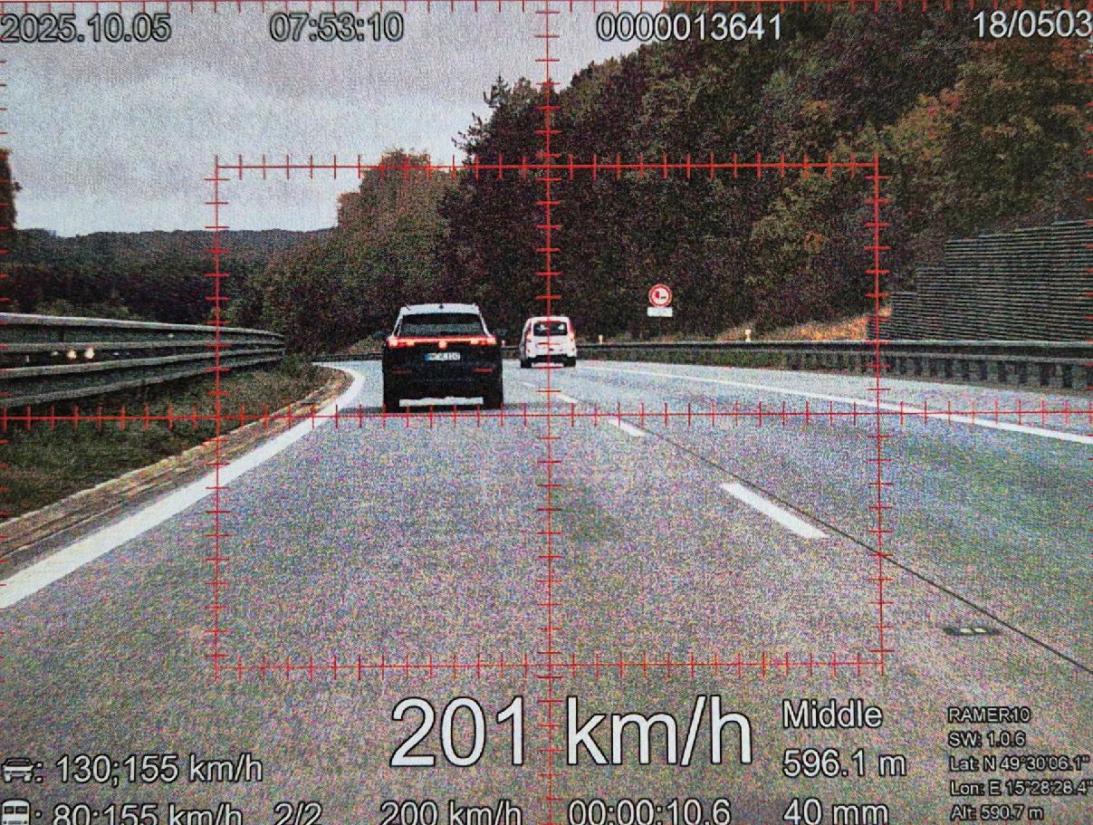 Se služebním motorovým vozidlem v civilním provedení, které je vybaveno zařízením sloužícím k měření rychlosti, změřili policisté v neděli 5. října vysokou rychlost osobnímu vozidlu Volkswagen Tayron s německou registrační značkou. Jednatřicetiletý řidič, jednalo se o státního příslušníka Polska, projížděl s vozidlem po dálnici D1 kolem osmé hodiny dopoledne ve směru jízdy na Prahu. V úseku na 99. kilometru, kde je nejvyšší dovolená rychlost 130 km/h, mu policisté naměřili rychlost 201 km/h. Osobní vozidlo bylo s ohledem na bezpečnost a plynulost provozu na dálnici předepsaným způsobem zastaveno na nejbližším dálničním sjezdu. Řidiče policisté vyzvali, aby předložil doklady potřebné k řízení a provozu vozidla. U řidiče policisté provedli orientační dechovou zkoušku, jejíž výsledek byl negativní. Policisté řidiči na místě zadrželi řidičský průkaz a zakázali mu další jízdu. Jelikož existovalo důvodné podezření, že se bude řidič vyhýbat řízení o přestupku, nebo že případné vymáhání uložené pokuty by bylo spojeno s nepřiměřenými náklady, popřípadě by nebylo vůbec možné, byla od výše jmenovaného vybrána kauce ve výši 10 000, kterou uhradil na místě.