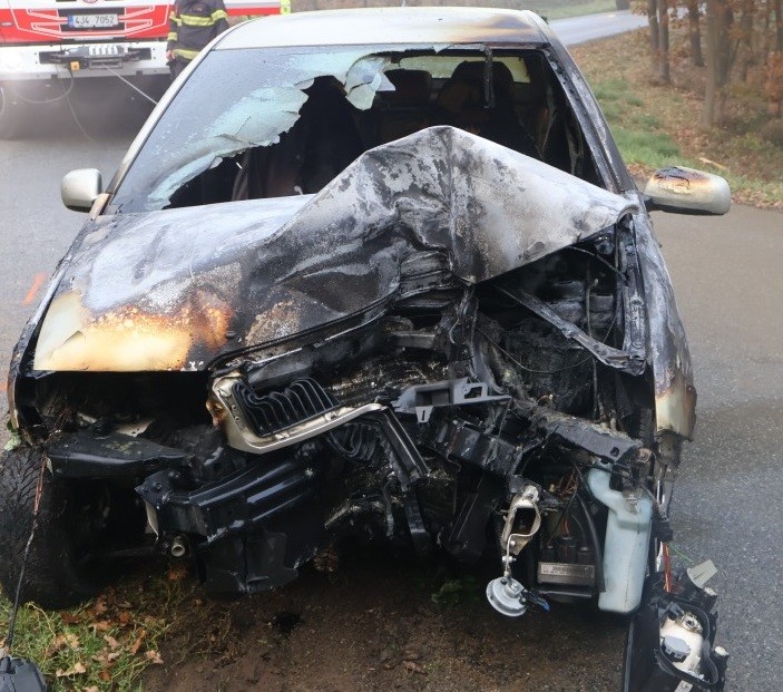 Po sedmé hodině ráno havarovala řidička osobního vozidla a automobil začal následně hořet.