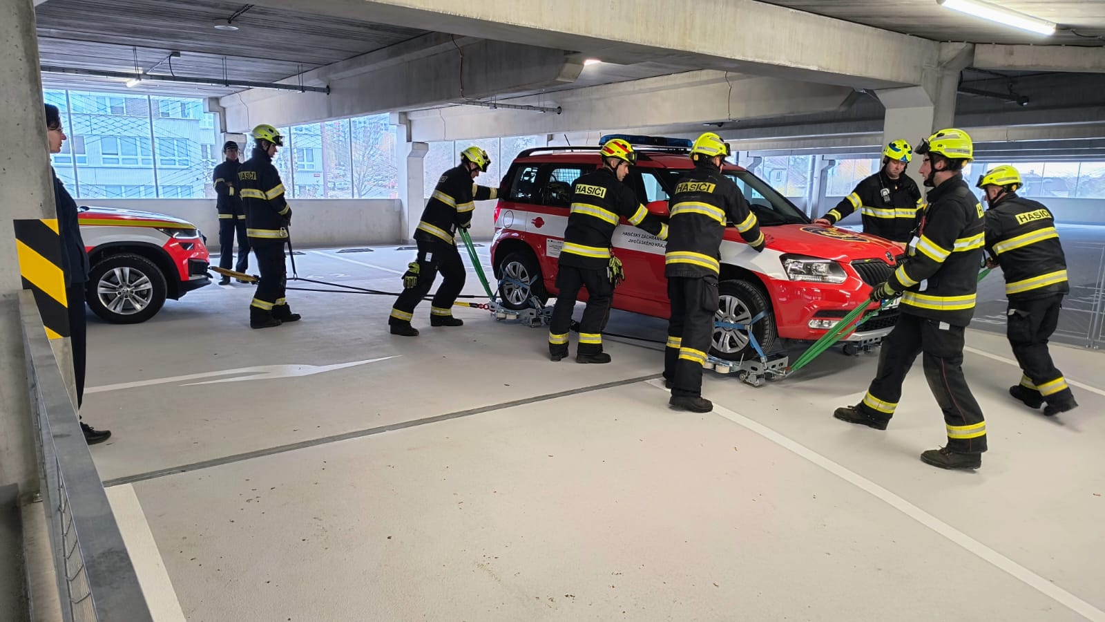I k cvičení na vyproštění elektromobilu po požáru z garáží.