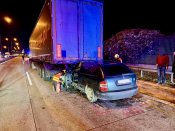 Probíhá vyprošťování automobilu z pod návěsu. Okruh je ve směru na Plzeň uzavřen.