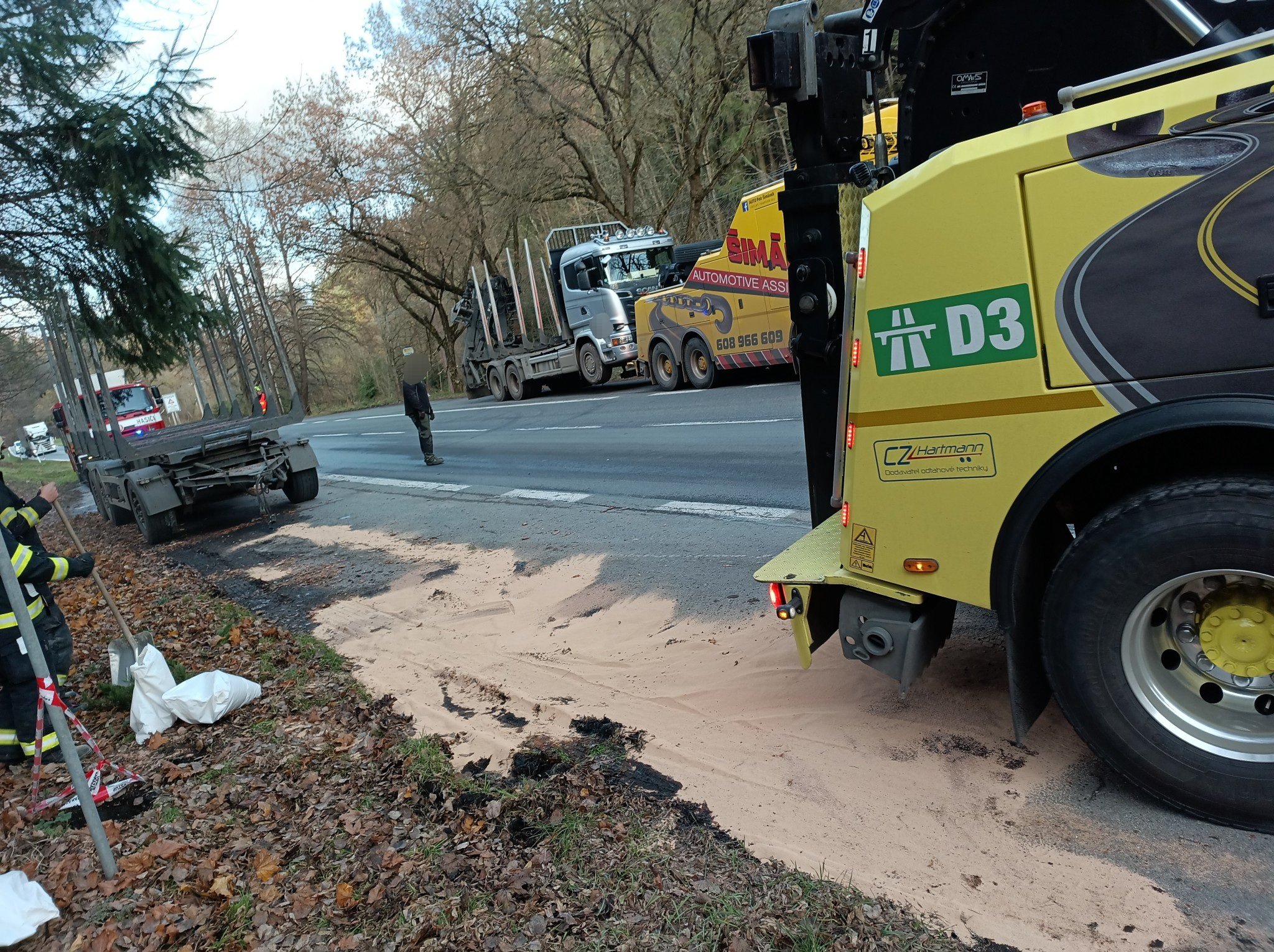 Masivní únik oleje na vozovku, z přepravníku dřeva, řešila včera, v úterý 11. listopadu 2025 okolo poledne Vimperská profesionální jednotka u Výškovic na Vimpersku.