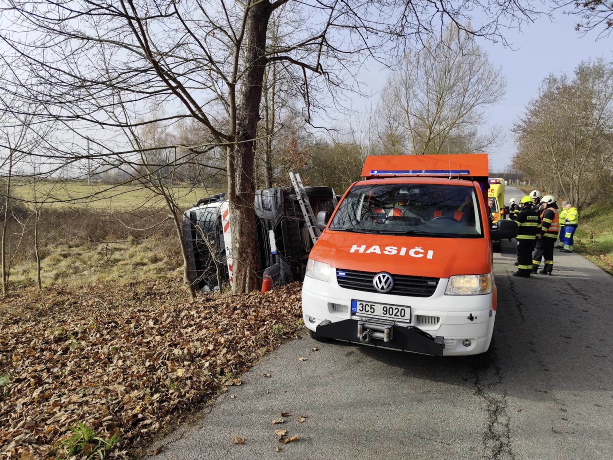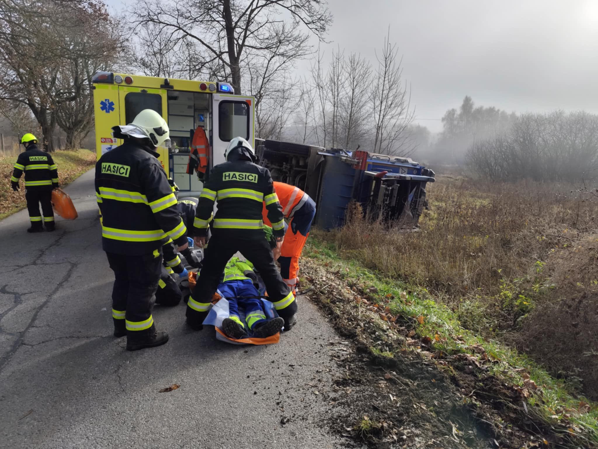 K popelářskému vozu převrácenému na bok vyrazily profesionální jednotka hasičů Kaplice a dobrovolná jednotka Vyšší Brod.