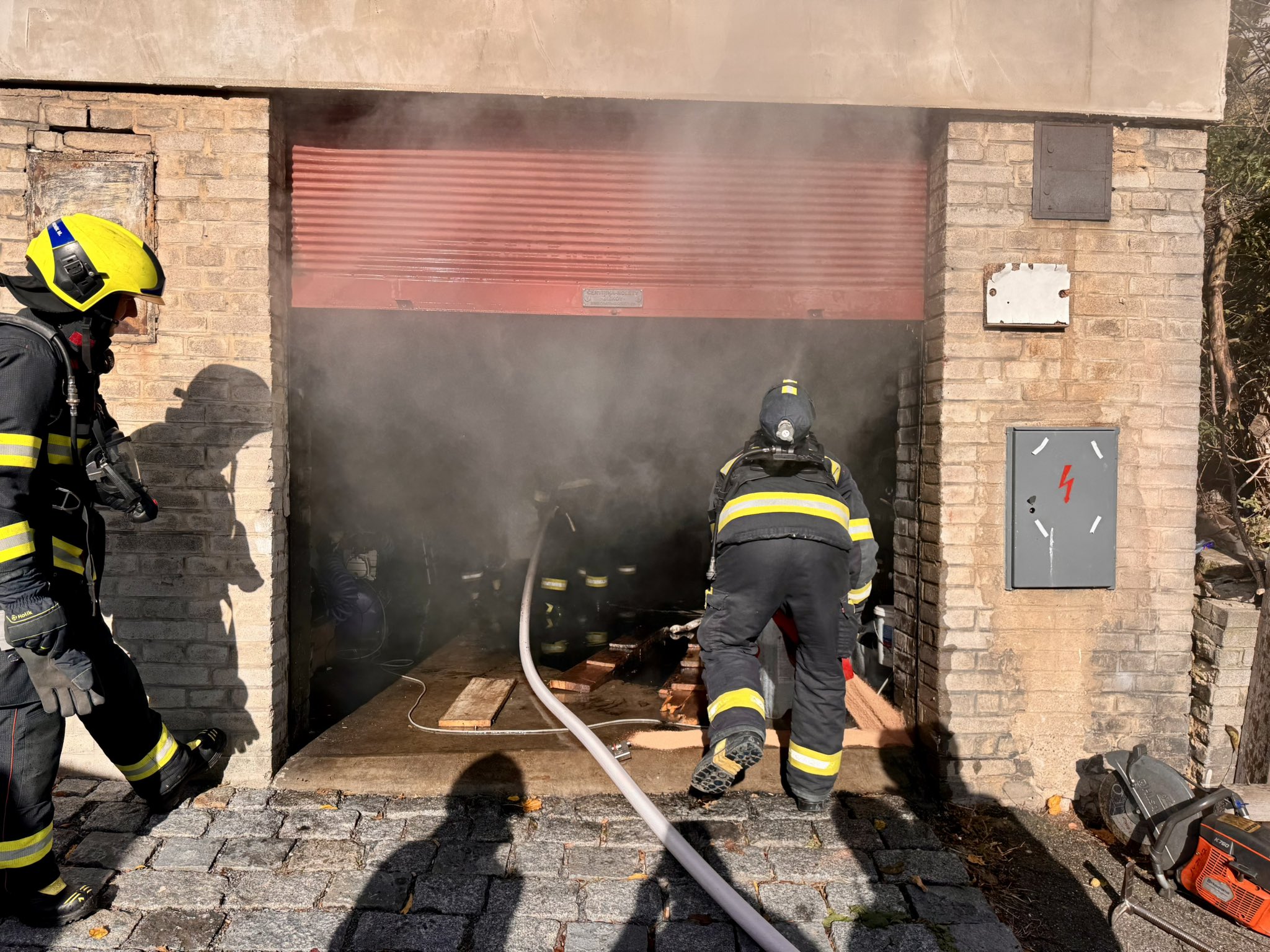K nahlášenému požáru garáže v ulici Na Pláni vyjely čtyři jednotky hasičů. Požár by uhašen jedním proudem.