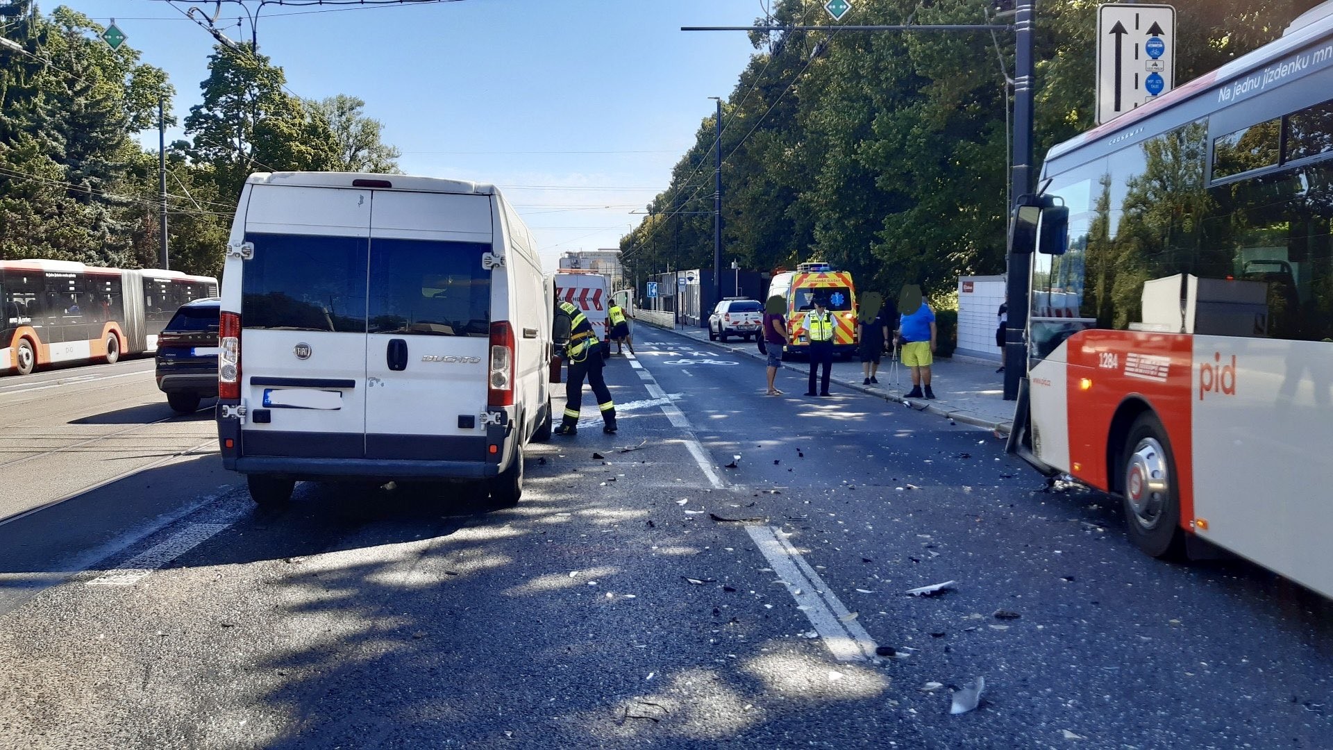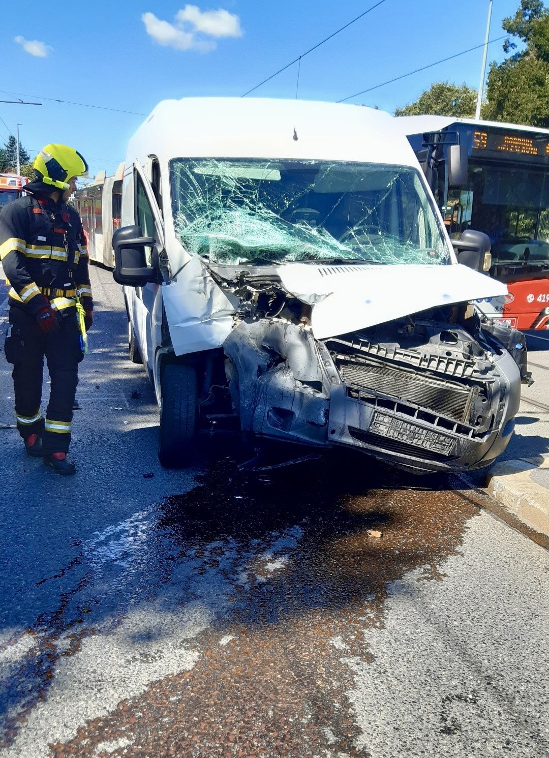 U nehody autobusu a dodávky zasahovali, včera v pondělí 18. srpna 2025 dopoledne, v ulici Za Vokovickou Vozovnou hasiči z Petřin.