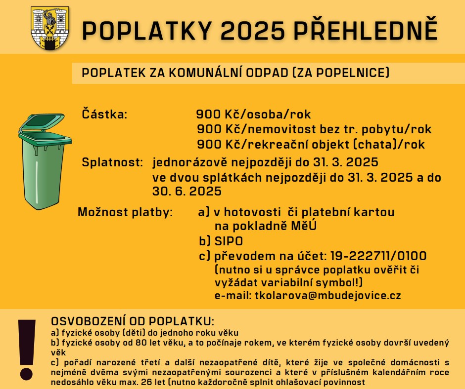 Město Moravské Budějovice upozorňujeme občany, že popelnice na směsný komunální odpad, které nebudou řádně označeny známkou na rok 2025, nebudou od 1. září 2025 vyvezeny.