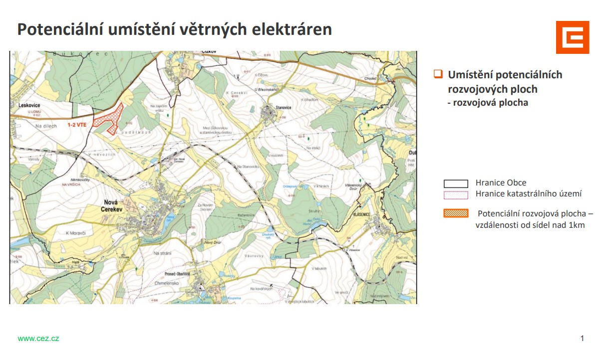 V návaznosti na listopadové veřejné projednání 12. listopadu začíná anketa mezi obyvateli městyse Nová Cerekev a jeho místních částí. Jejím cílem je zjistit stanovisko obyvatel k případné výstavbě maximálně dvou větrných elektráren severně od Nové Cerekve, u silnice I/19 mezi obcemi Leskovice a Čížkov. Důležité je zdůraznit, že výsledek této ankety ukáže vedení městyse, zda má, nebo nemá dále pokračovat v jednání s investory, kteří o vybudování větrníků jeví zájem.