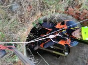 KLADNO: Pes spadl do studny - zásah hasičů v Hřebči - Kladno. Členové lezeckého družstva se pomocí trojnožky spustili dolů.